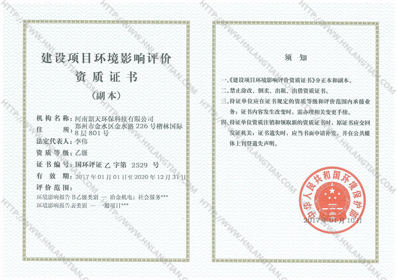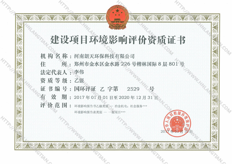 河南朗天環(huán)保科技有限公司,原為河南農(nóng)大風(fēng)景園林規(guī)劃設(shè)計院環(huán)境研究所,于2005年6月30日正式取得由國家環(huán)境保護部頒發(fā)的環(huán)境影響評價乙級資質(zhì)證書(國環(huán)評乙字第2529號),注冊地址鄭州市金水區(qū)金水路226號楷林國際8層801號,注冊資金500萬元。主要從事環(huán)境影響評價、環(huán)保技術(shù)咨詢、土壤環(huán)境調(diào)查、第三方環(huán)境監(jiān)查及督導(dǎo)、竣工環(huán)境保護驗收、突發(fā)環(huán)境事件應(yīng)急預(yù)案、區(qū)域環(huán)境現(xiàn)狀評估、排污許可申報、清潔生產(chǎn)審核、環(huán)境工程治理、空氣質(zhì)量精細化管控(專家組)等。公司在“以質(zhì)量求生存、以信譽求發(fā)展”經(jīng)營理念的指導(dǎo)下,秉承改善人類環(huán)境、實現(xiàn)最佳經(jīng)濟效益與環(huán)境效益之宗旨,倡導(dǎo)科技創(chuàng)新之精神,依托雄厚的技術(shù)力量,致力于環(huán)境影響評價工作及環(huán)境工程技術(shù)咨詢的科研工作。